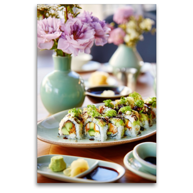 Dieses Sushi Bild zeigt eine kunstvoll angerichtete California Roll mit frischem Gemüse, cremiger Avocado und würzigem Sesam. Begleitet von Wasabi, Ingwer und Sojasauce wird die feine japanische Küche hier in detailreicher Food Art inszeniert. Die pastellfarbenen Blumenvasen im Hintergrund verstärken die elegante Präsentation und verleihen dem Bild eine harmonische Balance aus Genuss und Ästhetik. Ideal für Liebhaber von Sushi, Foodies und alle, die moderne asiatische Esskultur schätzen. Die Kombination aus kulinarischer Raffinesse und dekorativen Elementen macht dieses Sushi Bild zu einem Highlight für Feinschmecker und Genießer. Bild KI generiert.