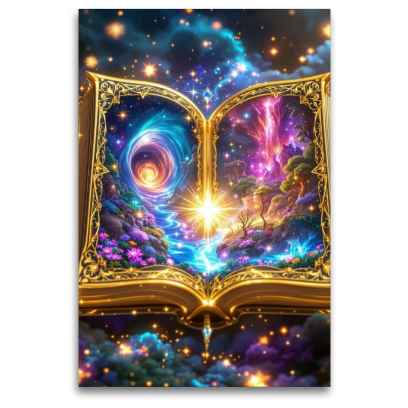 Ein Buch, das sich wie ein Tor in fantastische Welten öffnet: leuchtende Farben, magische Landschaften und detailreiche Texturen verschmelzen zu einem Bild voller Staunen. Aufgeschlagene Seiten offenbaren zwei gegensätzliche Welten – ein strahlender Fluss in sattem Blau und Violett, umgeben von üppiger Flora, gegenüber einer feurigen, pink-violetten Traumlandschaft unter funkelndem Sternenhimmel. Aus der Mitte des goldverzierten Einbands strahlt pures Licht, das die Szenen in magischem Glanz erhellt. Ein KI-generiertes Kunstwerk, das Fantasie wahr werden lässt und den Zauber des Unmöglichen greifbar macht.