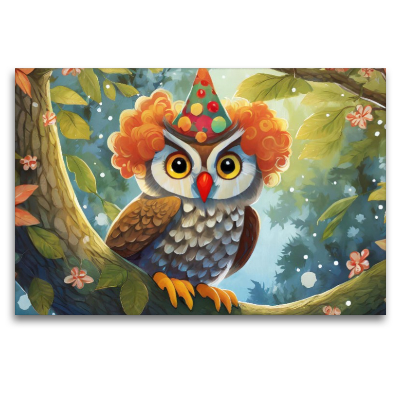 Die humorvolle Szene zeigt einen Kauz der sich als Clown verkleidet hat. Das Bild vermittelt die sprichwörtliche Redewendung 'Ein komischer Kauz sein' auf eine amüsante und charmante Weise.