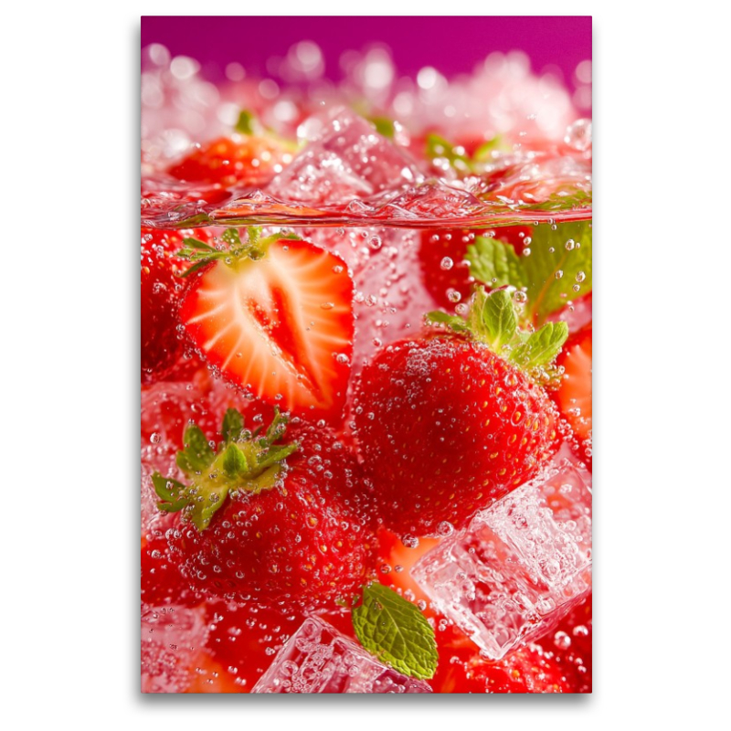 Leuchtend rote Erdbeeren schweben zusammen mit frischer Minze und glitzernden Eiswürfeln im sprudelnden Wasser und vermitteln pure Sommerfrische. Die saftigen Beeren stehen für Genuss, Vitalität und Lebensfreude und sind ein Symbol für sonnige Tage und fruchtige Leichtigkeit. Dieses Bild erinnert an Cocktails, Smoothies und kreative Rezepte und setzt farbenfrohe Akzente in Küche, Esszimmer oder Bar. Ideal für Foodies, Sommerfans und alle, die erfrischende Food Motive und fruchtige Drinks lieben. Ein energiegeladenes, modernes Motiv voller Frische und Lebensfreude. Bild KI generiert.
