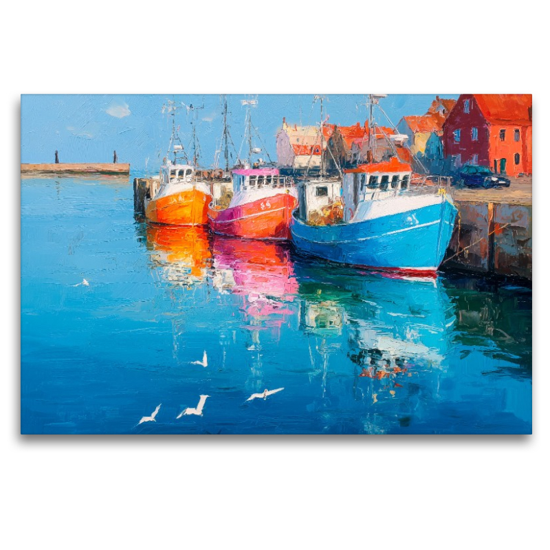 Dieses farbenfrohe Wandbild zeigt den Hafen von Hörnum auf Sylt mit traditionellen Fischerbooten, die im klaren Wasser der Nordsee liegen. Die intensiven Farben der Boote spiegeln sich im Wasser und schaffen eine lebendige Szenerie, die maritimes Flair und norddeutsche Lebensart perfekt einfängt. Im Hintergrund prägen typische Backsteinhäuser und der Hafen die Kulisse und unterstreichen die Atmosphäre des Insellebens. Die Acryloptik verstärkt die Leuchtkraft der Farben und verleiht dem Motiv eine besondere Ausdrucksstärke. Ideal für alle, die Sylt, die Nordsee und die maritime Kultur lieben und das einzigartige Gefühl nordischer Häfen in ihre Räume holen möchten. Bild mit KI generiert.