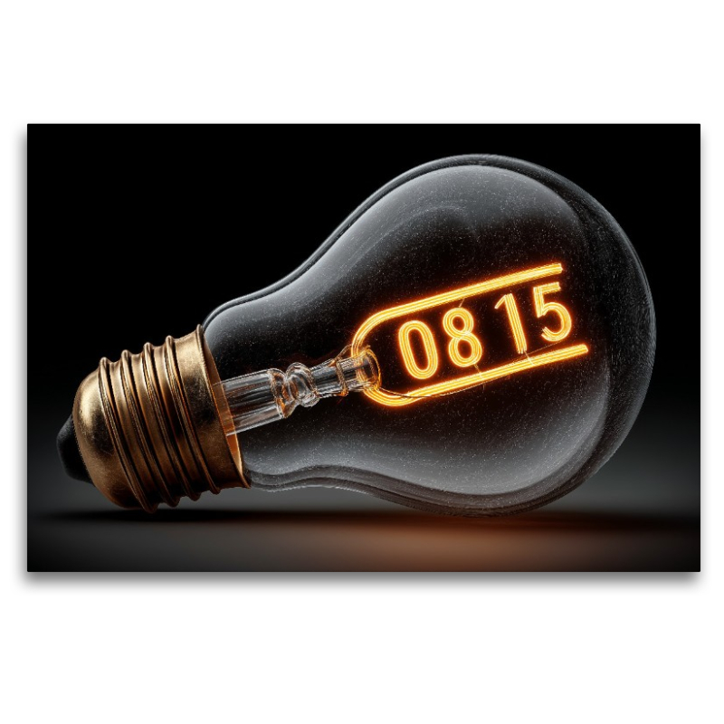 Eine Glühbirne mit dem Schriftzug „0815“ erstrahlt in warmem Licht und verbindet klassische Technik mit moderner Symbolik. Das Motiv spielt bewusst mit der bekannten Redewendung und verleiht ihr eine kreative, visuell starke Umsetzung. Glühbirne und Zahlensymbolik verschmelzen zu einem Design, das originell und zugleich tiefgründig wirkt. Für Menschen, die Kunst mit Bedeutung schätzen, ein Sinnbild für Individualität, Ausdrucksstärke und den Mut, Gewöhnliches neu zu interpretieren. Ein spannendes Motiv für Designliebhaber, Technikfreunde und kreative Köpfe. Bild KI generiert.