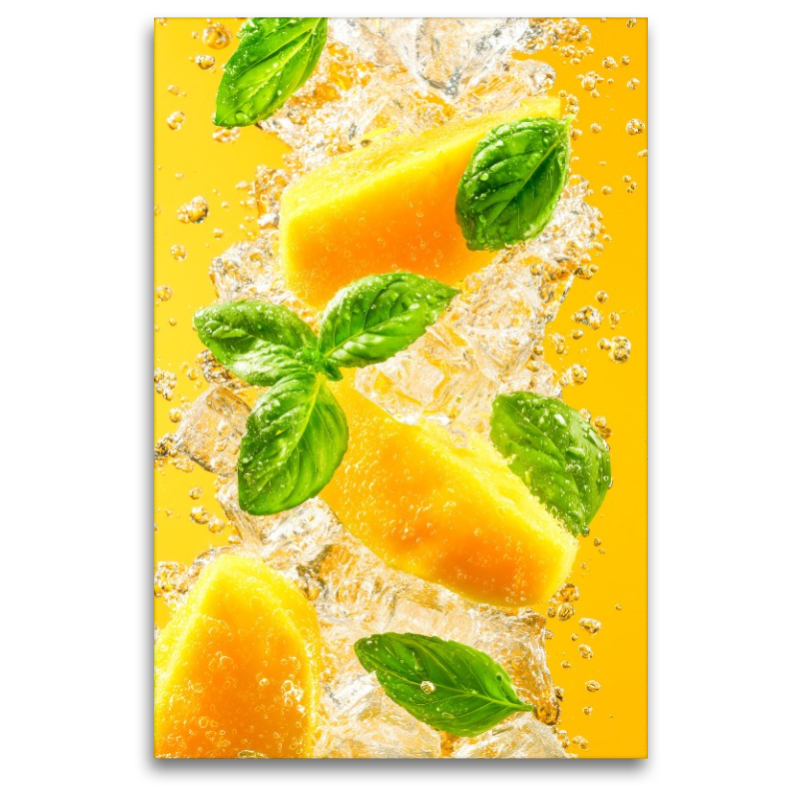 Saftige Mango, frische Basilikumblätter und sprudelnde Eiswürfel ergeben ein Bild voller Sommerfeeling und exotischer Erfrischung. Dieses Motiv erinnert an Cocktails, Drinks und kulinarische Kreativität und ist ein Highlight für Küche, Esszimmer oder die private Bar. Die leuchtenden Farben der Mango und das kräftige Grün des Basilikums symbolisieren Frische, Vitalität und Genuss. Ideal für Foodies, Cocktail-Liebhaber und alle, die Freude an fruchtigen Zutaten, modernen Food Motiven und sommerlicher Lebensfreude haben. Ein farbenstarker Akzent für Küche, Kochen und kreative Drinks. Bild KI generiert.