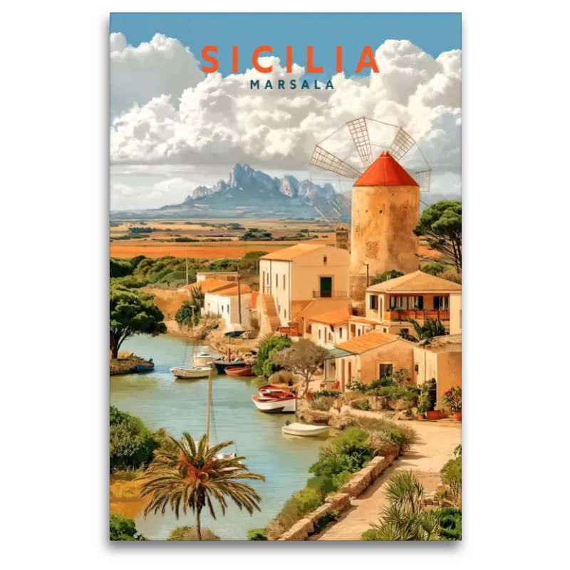 Dieser Poster im Old-School-Style präsentiert Sizilien in einer einzigartigen, künstlerischen Ästhetik. Das Bild wurde mithilfe künstlicher Intelligenz generiert und anschließend sorgfältig in Photoshop nachbearbeitet. Das Motiv ist eine kreative Interpretation bekannter Orte und fängt die besondere Atmosphäre der Insel ein. Dabei handelt es sich bewusst nicht um detailgetreue Abbildung, sondern um stilvolle, künstlerische Darstellung.