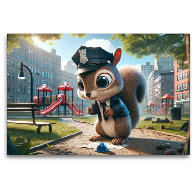 Ein Eichhörnchen in Polizeiuniform nimmt in einem lebhaften Stadtpark, der durch künstliche Intelligenz visualisiert wurde, fleißig Notizen. Mit einem wachsamen Blick überwacht es den Spielplatz und hält die Details des ruhigen Morgens fest. Die Sonne strahlt durch die Bäume, und die friedliche Atmosphäre wird durch die Gegenwart des kleinen Ordnungshüters noch verstärkt, der seine Pflicht mit Hingabe erfüllt.