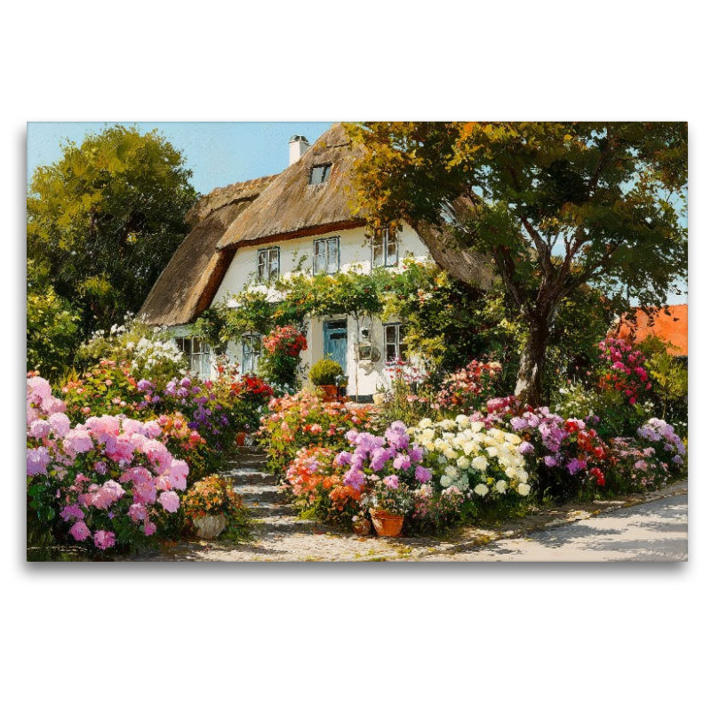 Dieses malerische Motiv zeigt ein traditionelles Reetdachhaus im friesischen Stil, eingebettet in einen prachtvollen Garten voller blühender Rosen und Hortensien. In Keitum, einem der schönsten Orte der Insel Sylt, verbindet sich norddeutsche Architektur mit farbenfroher Natur zu einem harmonischen Gesamtbild. Das Bild spiegelt die typische Atmosphäre der Nordsee wider: maritimes Flair, Ruhe, Idylle und das besondere Lebensgefühl Norddeutschlands. Die liebevoll gepflegten Gärten, das historische Reetdach und die sommerliche Blütenpracht machen dieses Motiv zu einem Symbol für Heimat, Romantik und Urlaubsträume am Meer. Ein stimmungsvoller Eindruck, der Sylt in seiner schönsten Form zeigt. Bild mit KI generiert.