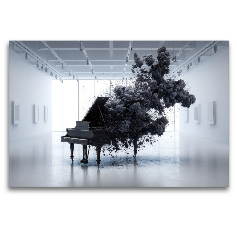 Dieses faszinierende Motiv zeigt einen schwarzen Konzertflügel, der sich in einem leeren weißen Raum aufzulösen scheint. Aus dem Instrument heraus entfaltet sich eine abstrakte, organische Form, die wie eine Verschmelzung aus Musik und Natur wirkt. Das Zusammenspiel von klarer Architektur, tiefem Schwarz und aufbrechender Struktur erzeugt eine spannende Dynamik zwischen Stille und Klang, Ordnung und Auflösung. Ideal für Musikliebhaber, die außergewöhnliche Kunstwerke schätzen, und für alle, die modernes Design mit kreativer Symbolik verbinden möchten. Ein visuell starkes Bild, das Emotionen weckt und Räume mit künstlerischer Tiefe bereichert. Bild mit KI generiert.