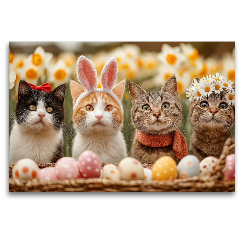Vier süße Katzen mit Osterhasenohren, Blumen und Ostereiern – fröhliches Frühlingsmotiv voller Charme und Niedlichkeit
