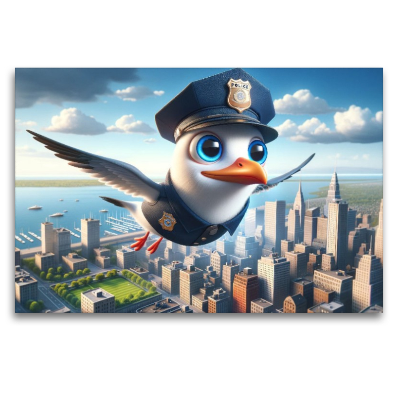 Dieses mit künstlicher Intelligenz erschaffene Bild zeigt eine Möwe in Polizeiuniform, die hoch über den imposanten Wolkenkratzern einer geschäftigen Metropole fliegt. Mit einem Fernglas ausgerüstet, hält sie Ausschau nach jeglichen Anzeichen von Unruhen oder Gefahren, die den Frieden der Stadt stören könnten. Die Morgensonne beleuchtet die Szene und wirft lange Schatten auf die strukturierten Straßenzüge, während die Möwe ihre Runden zieht.