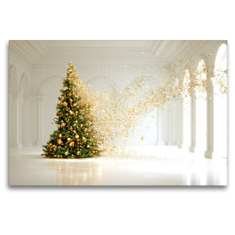 Dieses außergewöhnliche Motiv interpretiert die Weihnachtszeit modern und künstlerisch. Ein prachtvoll geschmückter Weihnachtsbaum steht in einem hellen, weißen Raum; goldene Partikel schweben wie Funken durch die Luft und verleihen der Szene einen edlen, festlichen Glanz. Die minimalistische Umgebung fokussiert den Blick auf Form, Licht und Details und schafft eine ruhige, zeitgemäße Atmosphäre. Ideal für alle, die stilvolle Weihnachtsdeko mit moderner Ästhetik verbinden möchten – im Wohnzimmer, Büro oder Galerieambiente. Ein Blickfang, der Eleganz, Wärme und feierliche Stimmung vereint. Bild mit KI generiert.