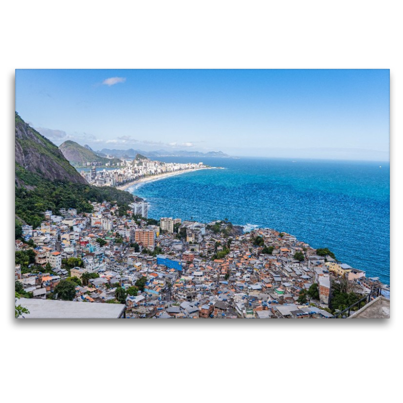 Die faszinierende Architektur der Favelas, die sich steil die Hänge hinaufzieht, direkt über dem tiefblauen Atlantik. Ein starkes Bild voller Kontraste, das die soziale und geografische Vielschichtigkeit Rios dokumentiert.