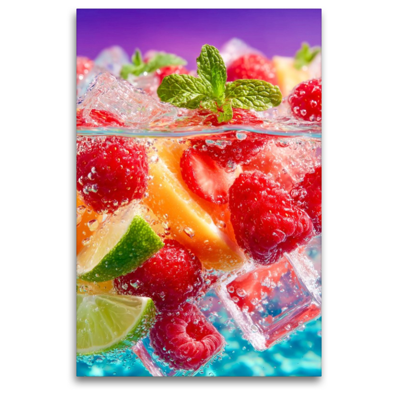 Saftige Himbeeren, frische Limetten und Orangenstücke vereinen sich mit sprudelndem Wasser, Minze und Eiswürfeln zu einem Bild voller Frische, Farbe und Energie. Dieses Motiv erinnert an Cocktails, Sommerdrinks und fruchtige Rezepte und bringt pure Lebensfreude in Küche, Esszimmer oder Bar. Die Kombination aus kräftigen Farben und spritziger Leichtigkeit macht es zu einem modernen Food Bild, das Foodies, Cocktail-Liebhaber und Sommerfans begeistert. Ein farbenfroher Akzent für alle, die Erfrischung, Fruchtvielfalt und kreative Food Motive schätzen. Bild KI generiert.