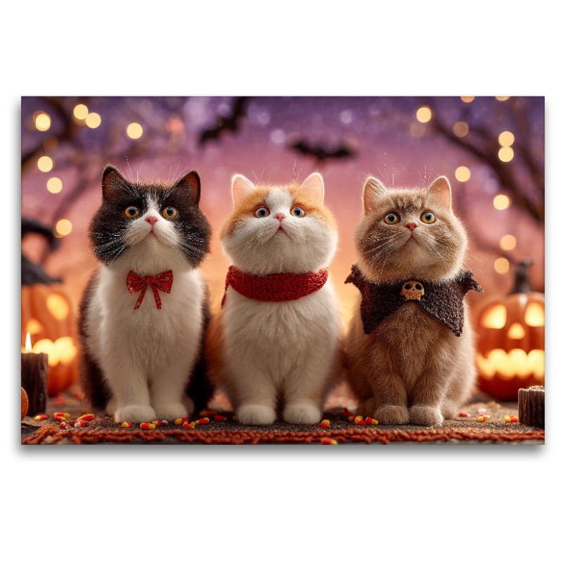 Drei Halloween Katzen sitzen zwischen Kürbissen, Kerzen und herbstlicher Deko. Mit Schleifen und kleinen Kostümen verkörpern sie perfekt die Stimmung von Halloween. Ob als „Halloween Katzen“, „Katze mit Kürbis“ oder „Katzenmotiv für Herbst“ – dieses Bild spricht Tierfreunde, Familien und Katzenliebhaber gleichermaßen an. Die Kombination aus süßen Katzen, Kürbislichtern und mystischer Abendstimmung sorgt für ein einzigartiges, dekoratives Motiv. Ideal für alle, die Katzen mit Humor, Herbstfarben und festlicher Stimmung verbinden. Bild KI generiert.