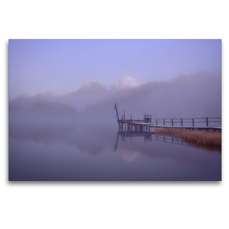 Ein hölzerner Steg führt in den stillen See, aus dem Nebel aufsteigt. Die Bergsilhouetten verschwimmen im Schleier, Schneegipfel leuchten sanft im Morgenlicht.