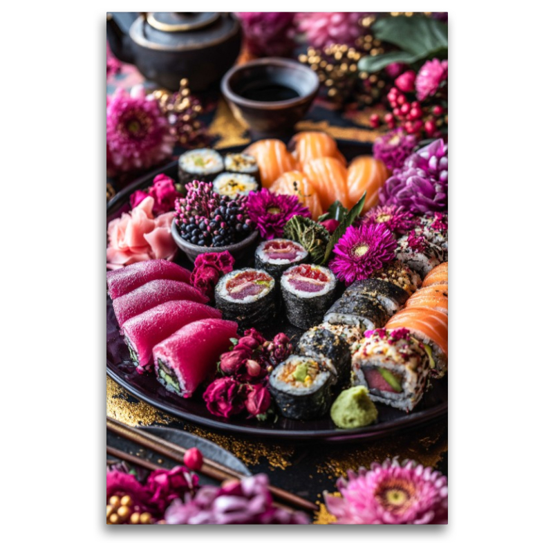 Ein kunstvolles Sushi Bild zeigt eine reich gefüllte Platte mit Nigiri, Maki, Lachs, Thunfisch und Gemüse – angerichtet wie ein wahres Food Art Kunstwerk. Umrahmt von leuchtenden Blumen und kräftigen Farben verbindet dieses Bild kulinarischen Genuss mit ästhetischer Präsentation. Die japanische Küche steht für Eleganz, Vielfalt und Harmonie, und genau das spiegelt dieses Sushi Arrangement wider. Ideal für Liebhaber von asiatischem Essen, Foodies und alle, die detailreiche Bilder mit kulinarischem Flair schätzen. Dieses Sushi Bild bringt die Schönheit japanischer Esskultur stilvoll zur Geltung und sorgt für ein Highlight voller Genuss und Farbenpracht. Bild KI generiert.